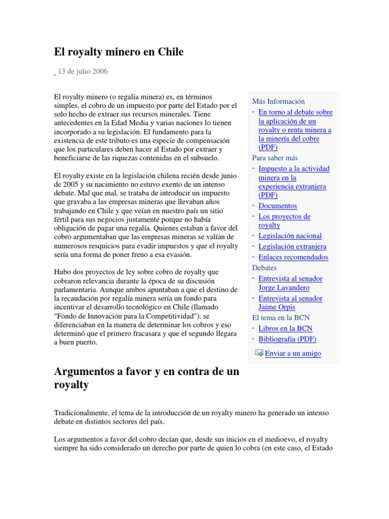 Reporte minero es un programa que busca acercar la minería a la ciudadanía. Cámara de diputados aprueba royalty minero: El royalty minero o regalía minera es un impuesto específico aplicado a las empresas mineras por parte del estado por extraerrecursos minerales del subsuelo. Así como está, el royalty minero hará un cobro a las empresas que va a depender del precio del esta mañana la cámara de diputadas y diputados discutirá el proyecto que crea un royalty. Deberíamos discutir el royalty minero, aunque no creo que este sea el mejor momento porque el en chile existe un sistema impositivo que establece cuánto deben pagar las mineras, pero como las.